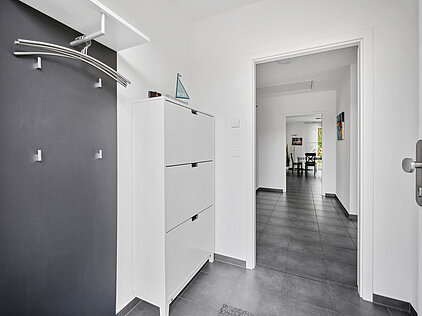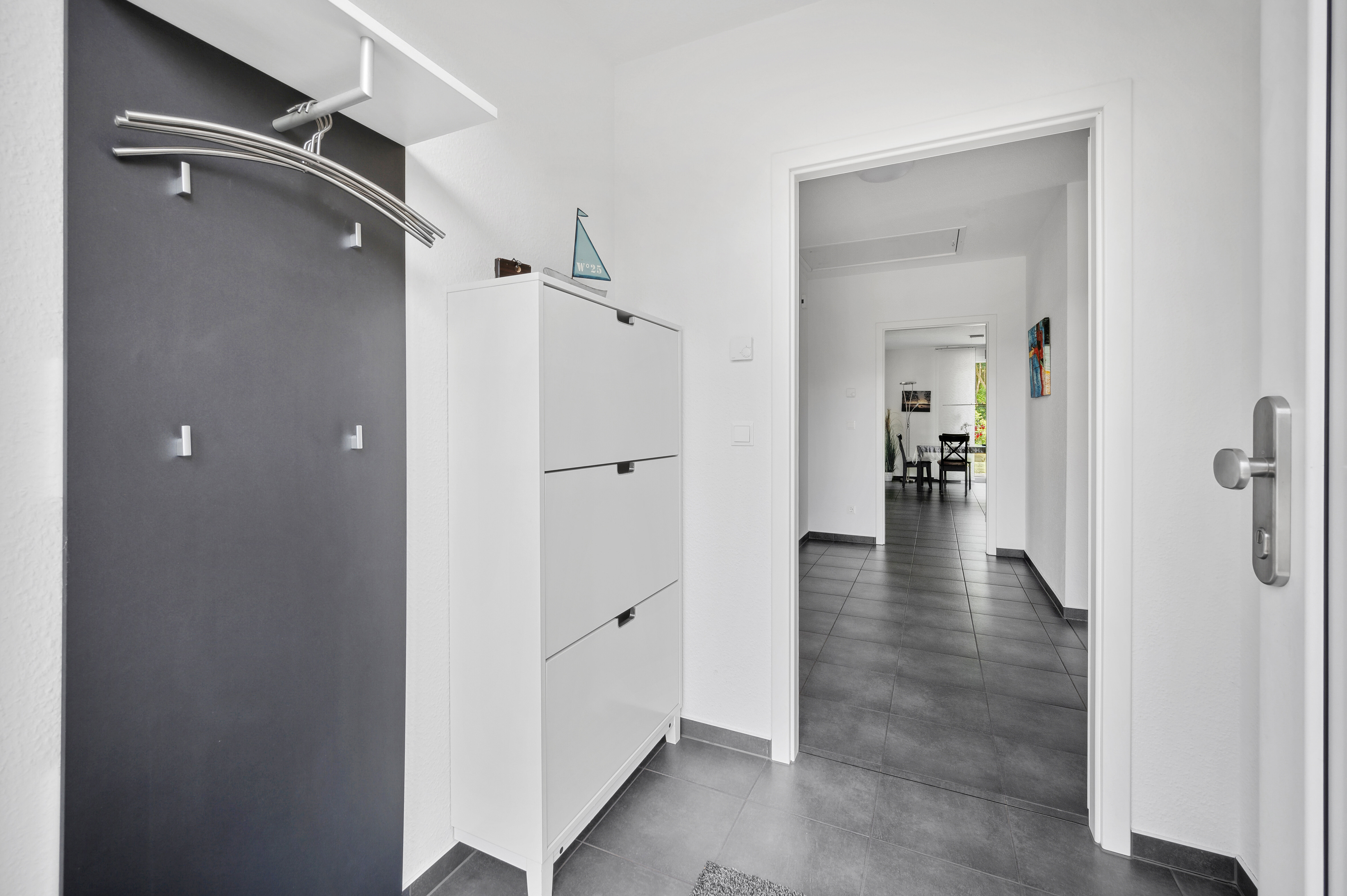 Das geräumige Badezimmer verfügt über ein WC, ein ebenerdiges Duschsystem mit Regendusche sowie eine Badewanne und einen Handtuchheizkörper. Größtmögliche Flexibilität – auch bei voller Belegung - gewährt das separate Gäste-WC.